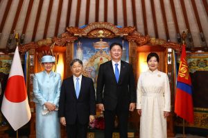 Монгол Улсын Ерөнхийлөгч Ухнаагийн Хүрэлсүх, гэргий Лувсандоржийн Болорцэцэг болон Япон Улсын Цог Жавхлант Эзэн Хаан Нарүхито, Эрхэм дээд Хатан Масако нар албан ёсны уулзалт хийлээ.